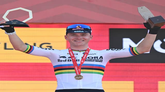 Remco Evenepoel heeft dinsdag zijn zesde zege van het seizoen geboekt voor zijn nieuwe ploeg Red Bull-BORA-hansgrohe. De Belg won de tijdrit in de UAE Tour en nam de leiding in het klassement over van Isaac del Toro.