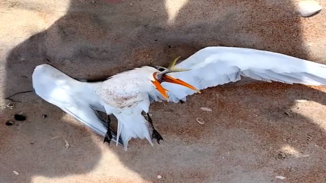 Video | Voorbijgangers redden meeuw met ogen groter dan zijn maag